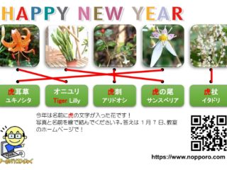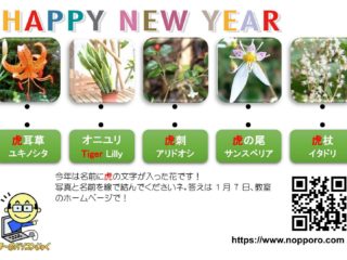 ということで、年賀状クイズの解答です。虎耳草(ユキノシタ)Tiger Lilly(オニユリ)虎刺(アリドオシ)虎の尾(サンスベリア)虎杖(イタドリ)いかがでしたでしょうか?皆さん、合ってました?(^^)v